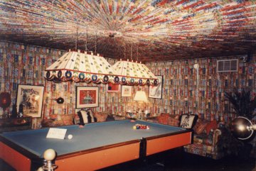 In 1995 it was announced that the Grateful Dead would be playing two nights(4/1 & 4/2) at the Pyramid Arena in Memphis. Since this was going to be my birthday weekend, I decided I needed to be there. So I flew out and met all my touring buddies for two days of psychadelic mayhem. The morning of sunday 4/2/95, the whole lysergic crew piled in the car and headed off for Graceland. When we arrived our pupils got even larger as we encountered a line that was probably 100 people deep. Amazingly, someone in the group(Chey or Mindy) actually had the forethought to make reservations for the whole group. (Word to the wise: if you are thinking of going to Graceland, take my word for it, MAKE RESERVATIONS). So they ushered us in to the next group and off we went to that big white mansion on the hill. First thing you learn is, NO one goes upstairs. DAMMIT! Second thing you learn is, Elvis was one tacky muthafucker! To get to the pool room you gotta walk through hanging strands of beads. The "Jungle" room had green shag carpet from floor to ceiling(literally on the ceiling) and velour covered lamp shades. And if you've ever see the Simpsons episode where Bart & Lisa write a script for the Itchy & Scratchy show, you've seen exactly what Elvis' television room looks like. Complete with 3 tv sets and his famous TCB lightning bolt logo painted on the yellow walls. Here are pix of each room.
